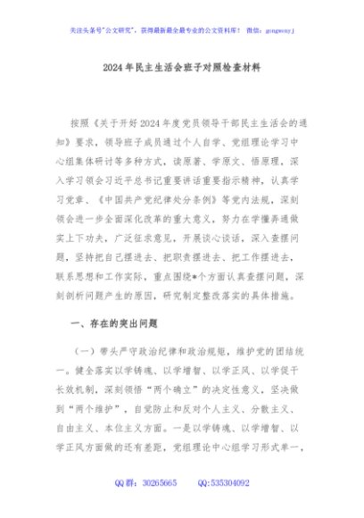 / 2024年民主生活会班子对照检查材料