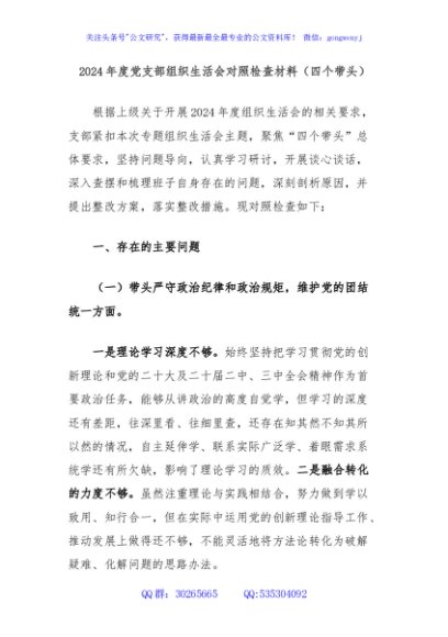 / 2024年度党支部组织生活会对照检查材料(四个带头)