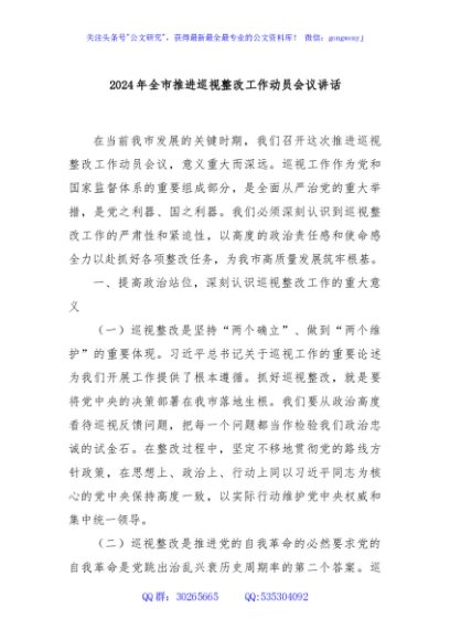 / 2024年全市推进巡视整改工作动员会议讲话
