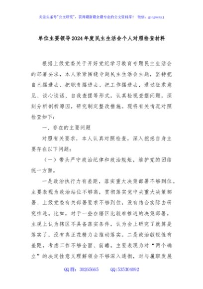 / 单位主要领导2024年度民主生活会个人对照检查材料