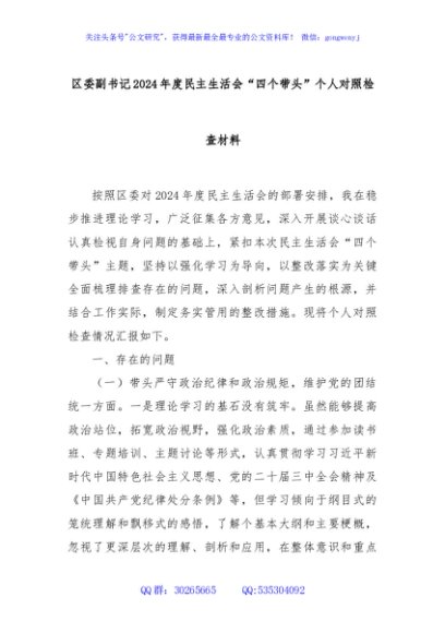 / 区委副书记2024年度民主生活会“四个带头”个人对照检查材料