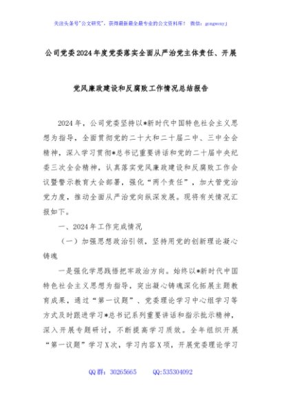 / 公司党委2024年度党委落实全面从严治党主体责任、开展党风廉政建设和反腐败工作情况总结报告