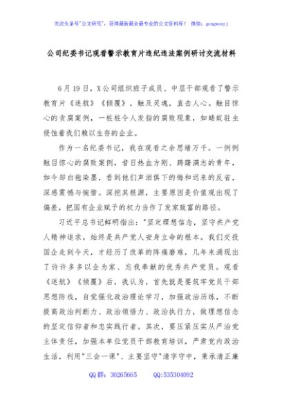公司纪委书记观看警示教育片违纪违法案例研讨交流材料