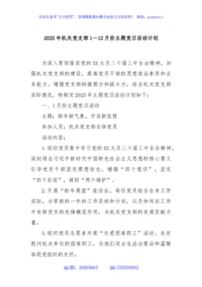 / 2025年机关党支部1-12月份主题党日活动计划