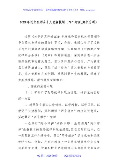 / 2024年民主生活会个人发言提纲(四个方面_案例分析)