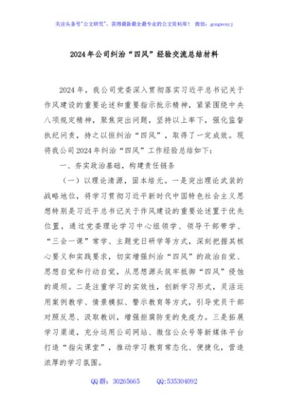 / 2024年公司纠治“四风”经验交流总结材料