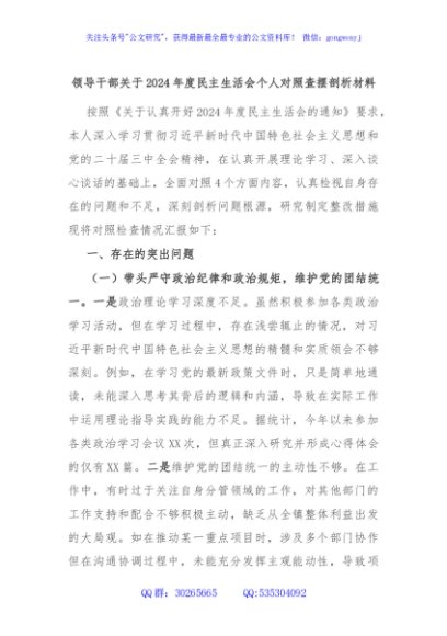 / 领导干部关于2024年度民主生活会个人对照查摆剖析材料
