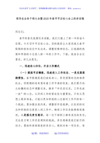 / 领导在全体干部大会暨2025年春节节后收心会上的讲话稿