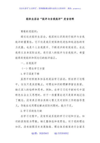 组织生活会“批评与自我批评”发言材料
