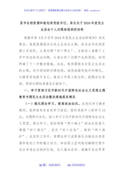 / 某市自然资源和规划局党组书记、局长关于2024年度民主生活会个人对照检视剖析材料