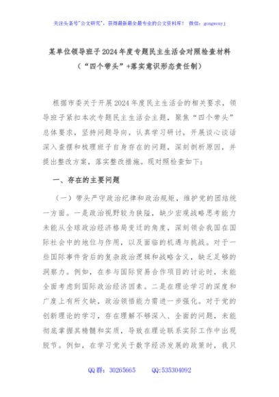 / 某单位领导班子2024年度专题民主生活会对照检查材料(“四个带头”+落实意识形态责任制)