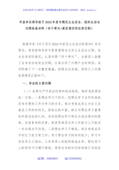 / 市直单位领导班子2024年度专题民主生活会、组织生活会对照检查材料(四个带头+落实意识形态责任制)