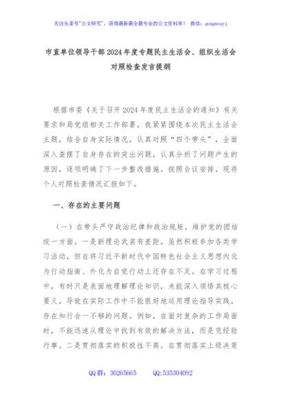 / 市直单位领导干部2024年度专题民主生活会、组织生活会对照检查发言提纲