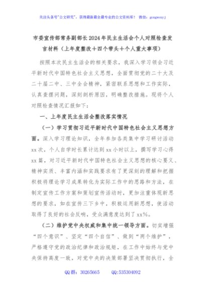 / 市委宣传部常务副部长2024年民主生活会个人对照检查发言材料(上年度整改+四个带头+个人重大事项)