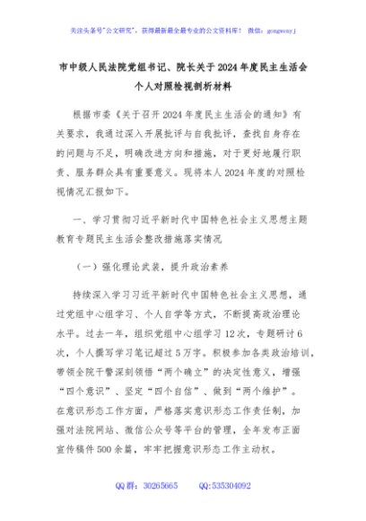 / 市中级人民法院党组书记、院长关于2024年度民主生活会个人对照检视剖析材料