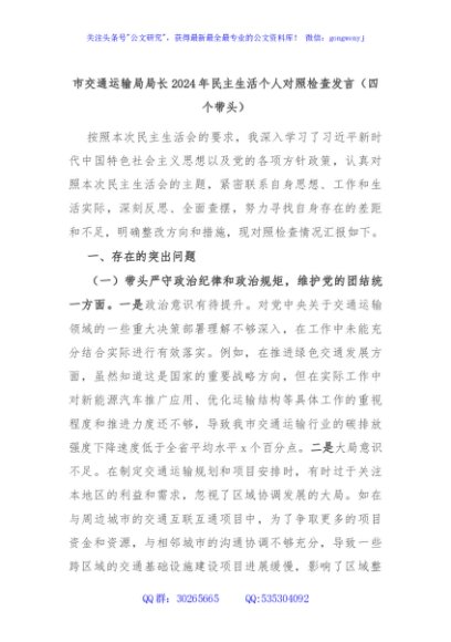 / 市交通运输局局长2024年民主生活个人对照检查发言(四个带头)