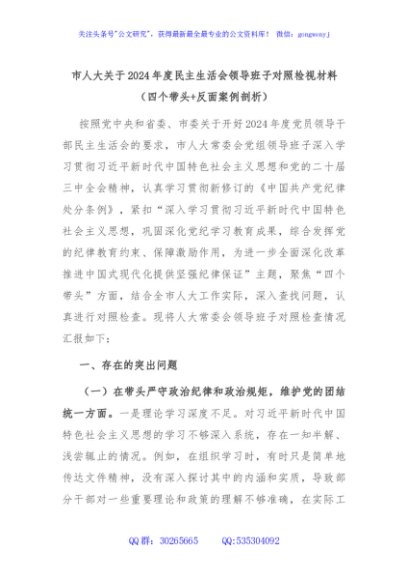 / 市人大关于2024年度民主生活会领导班子对照检视材料(四个带头+反面案例剖析)