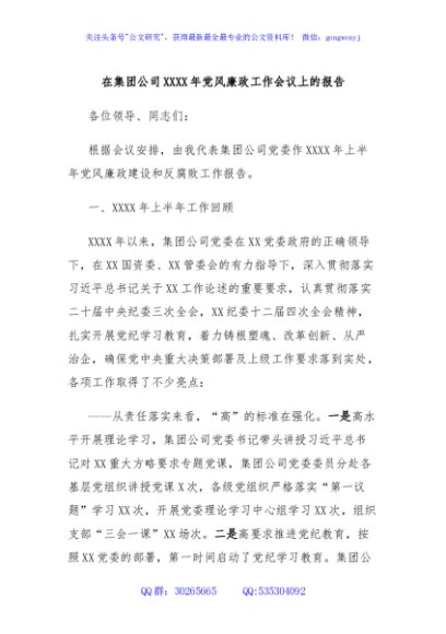 / 在集团公司XXXX年党风廉政工作会议上的报告