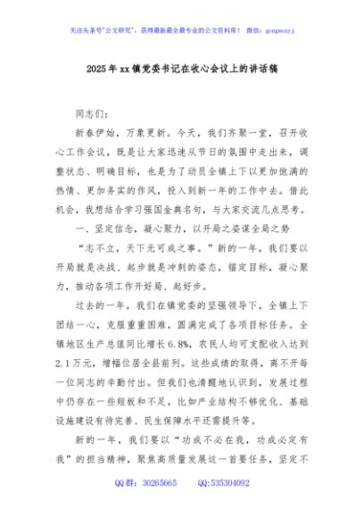 / 2025年xx镇党委书记在收心会议上的讲话稿