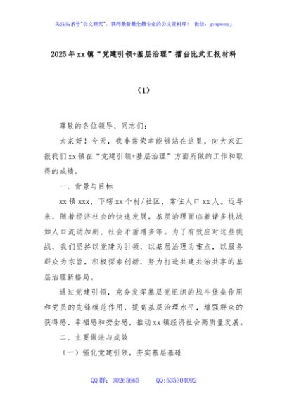 / 2025年xx镇“党建引领+基层治理”擂台比武汇报材料(1)