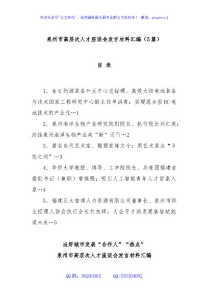/ (5篇)泉州市高层次人才座谈会发言材料汇编