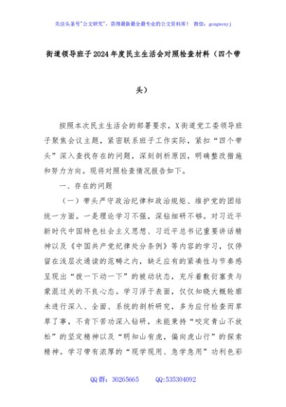 / 街道领导班子2024年度民主生活会对照检查材料(四个带头)