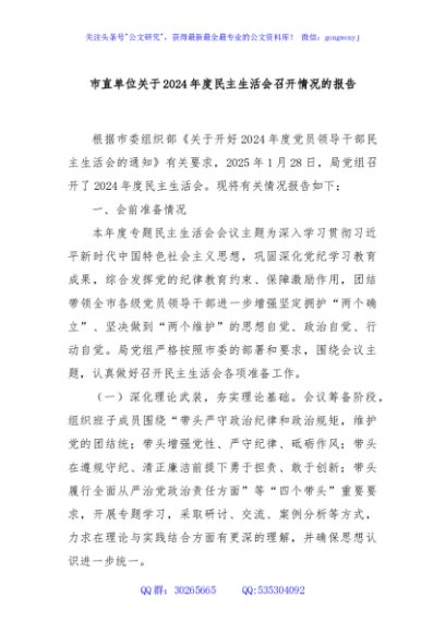 / 市直单位关于2024年度民主生活会召开情况的报告