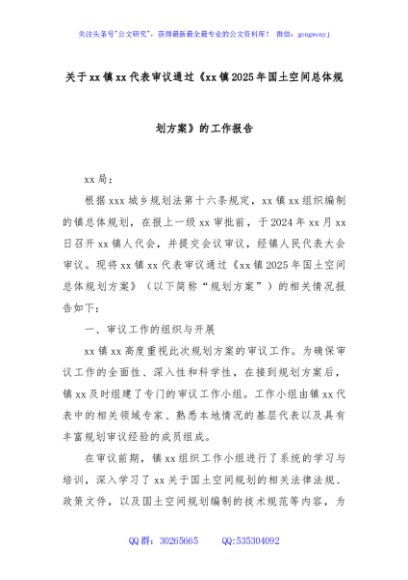 / 关于xx镇xx代表审议通过《xx镇2025年国土空间总体规划方案》的工作报告
