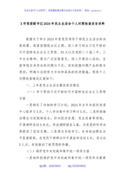 / X市党委副书记2024年民主生活会个人对照检查发言材料
