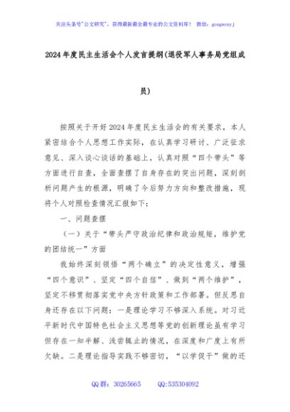 / 2024年度民主生活会个人发言提纲(退役军人事务局党组成员)