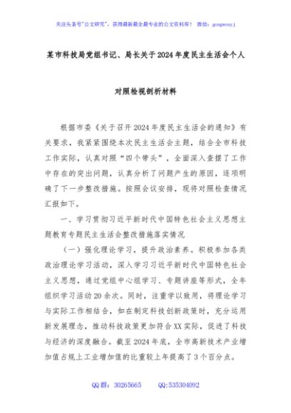 / 某市科技局党组书记、局长关于2024年度民主生活会个人对照检视剖析材料