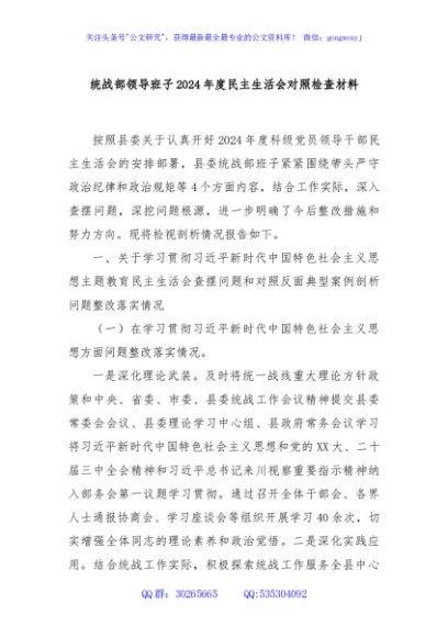 / 统战部领导班子2024年度民主生活会对照检查材料