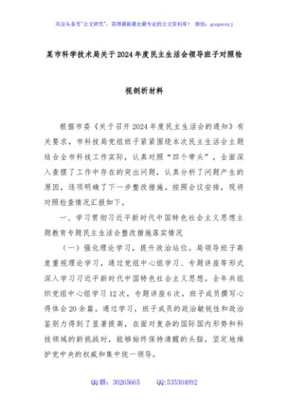 / 某市科学技术局关于2024年度民主生活会领导班子对照检视剖析材料