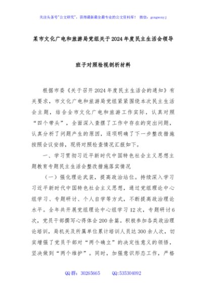 / 某市文化广电和旅游局党组关于2024年度民主生活会领导班子对照检视剖析材料