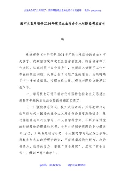 / 某市水利局领导2024年度民主生活会个人对照检视发言材料