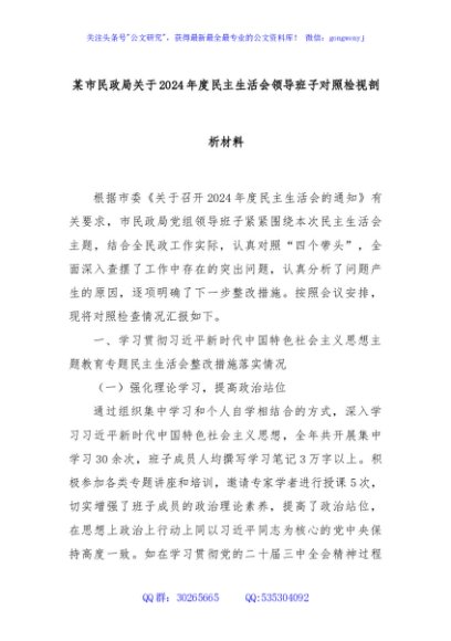 / 某市民政局关于2024年度民主生活会领导班子对照检视剖析材料