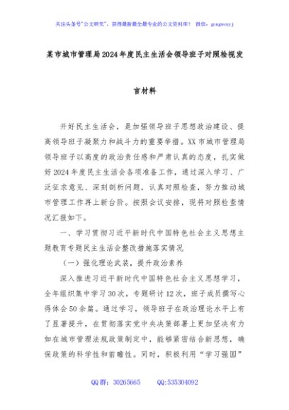 / 某市城市管理局2024年度民主生活会领导班子对照检视发言材料