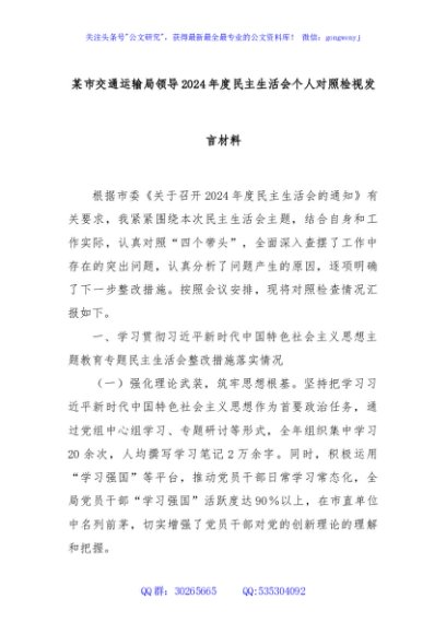 / 某市交通运输局领导2024年度民主生活会个人对照检视发言材料
