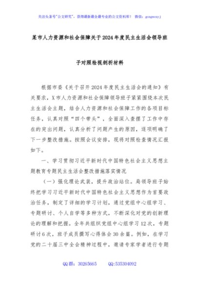 / 某市人力资源和社会保障关于2024年度民主生活会领导班子对照检视剖析材料