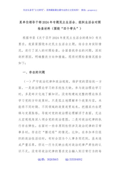 / 某单位领导干部2024年专题民主生活会、组织生活会对照检查材料(围绕“四个带头”)