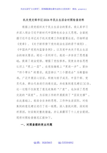 / 机关党支部书记2024年民主生活会对照检查材料