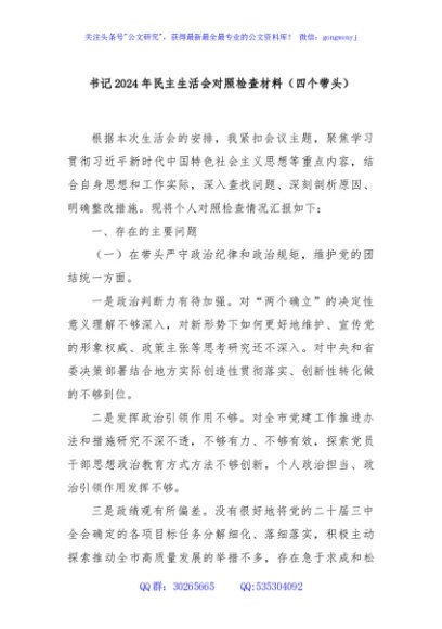 / 书记2024年民主生活会对照检查材料(四个带头)