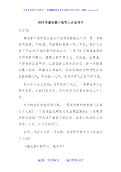 / 2025年廉政警示教育大会主持词