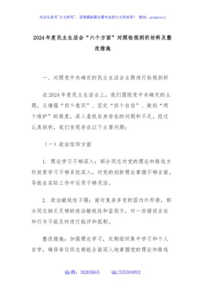 / 2024年度民主生活会“六个方面”对照检视剖析材料及整改措施