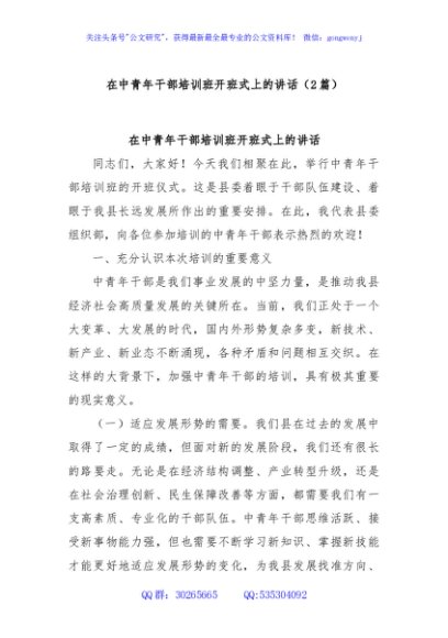 (2篇)在中青年干部培训班开班式上的讲话