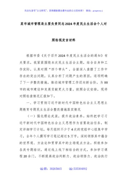 / 某市城市管理局主要负责同志2024年度民主生活会个人对照检视发言材料