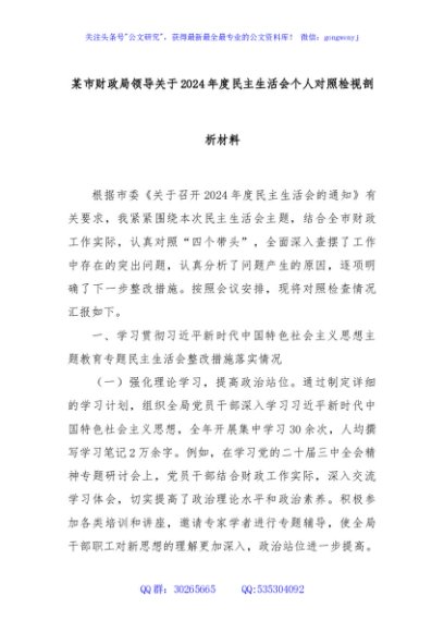 / 某市财政局领导关于2024年度民主生活会个人对照检视剖析材料