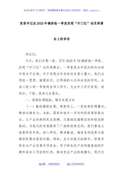 / 党委书记在2025年镇拼抢一季度实现“开门红”动员部署会上的讲话