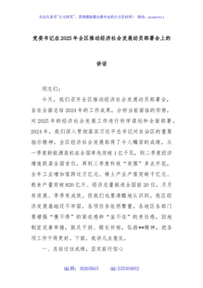 / 党委书记在2025年全区推动经济社会发展动员部署会上的讲话