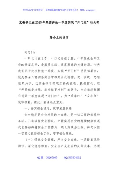/ 党委书记在2025年集团拼抢一季度实现“开门红”动员部署会上的讲话